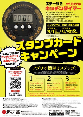 京都北白川発祥、鶏がらと野菜などをじっくり炊きだして作られたこってりスープが人気の中華そば専門チェーン店「天下一品」(本社:滋賀県大津市、グループ累計210店舗を展開中※)は、2025年3月1日(土)より全国の天下一品にて「アプリでスタンプカードキャンペーン ステージ2」を開催いたします。※2025年2月19日(水)時点での店舗数です。