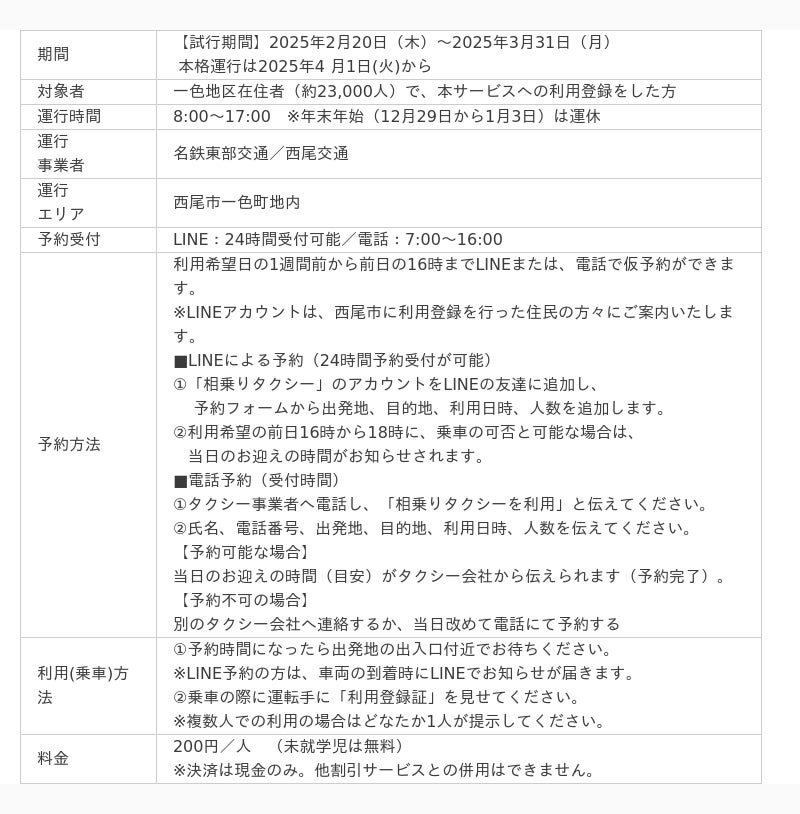 西尾市が一色地区で運行しているコミュニティバス「いっちゃんバス」が、利用者数の低迷を理由に3月末で廃止となります。4月から本格運行を開始する西尾市の「相乗りタクシー」は、「いっちゃんバス」の代替手段として、一色地区の住民の方々の日常の移動をサポートする役割を担います。