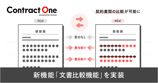 働き方を変えるDXサービスを提供するSansan株式会社は、契約データベース「Contract One(コントラクトワン)」において、契約更新などで新たな契約書を作成する際に、新旧の契約書間の差分を自動検出する「文書比較機能」の提供を開始しました。これにより、契約締結時の内容確認にかかる手間を大幅に削減します。