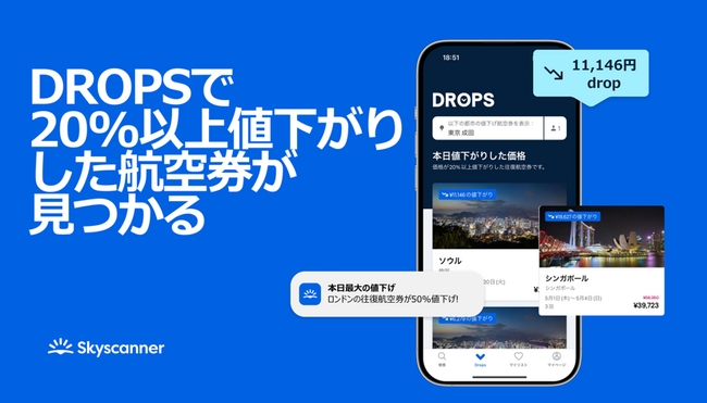 これまで様々な形で利用ユーザーの旅行計画をお得に、そして快適になるように取り組んできたスカイスキャナー。旅行者がより計画的に旅行を準備するようになるにつれて「もっとおトクに旅行をしていきたい」といった声をよく耳にするようになりました。これらのお声を受けて、この度新たにおトクな航空券が一覧で見れるアプリ限定機能「DROPS」をローンチいたします!