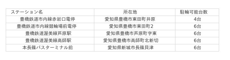 OpenStreet株式会社(本社:東京都港区、代表取締役社長CEO:工藤 智彰、以下「OpenStreet」)、マルシメ株式会社(所在地:愛知県豊橋市、代表取締役社長:大熊 康丈、以下「マルシメ」)、豊橋鉄道株式会社(本社:愛知県豊橋市、代表取締役社長:岩ヶ谷 光晴、以下「豊橋鉄道」)は、2025年2月より愛知県豊橋市内および新城市内の5カ所に、「HELLO CYCLING」のステーションを設置したことをお知らせします。豊橋鉄道沿線での「HELLO CYCLING」ステーション設置は今回が初めてで、今後はさらに設置場所を拡大していく予定です。