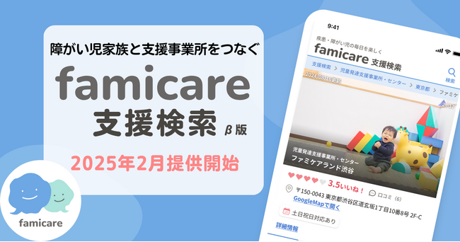 「疾患・障がい児家族の毎日を楽しく!」を目指すファミケア(運営:株式会社NEWSTA、東京都渋谷区、代表:鈴木碩子)は、障がい児家族と支援事業者(児童発達支援・放課後等デイサービス・短期入所・訪問看護・訪問介護等)をつなぐマッチングサービス「ファミケア支援検索 β版」の提供を開始いたします。