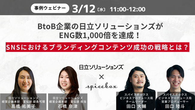 株式会社スパイスボックス(本社:東京都港区 代表取締役社長:田村栄治)は、2025年3月12日(水)に、無料オンラインセミナー「BtoB企業の日立ソリューションズがENG数(※1)1,000倍(※2)を達成! SNSにおけるブランディングコンテンツ成功の戦略とは?」を開催します。
