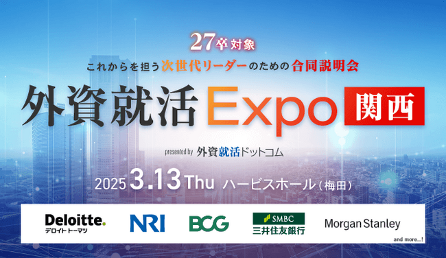 上記のような背景を受け、関東で就職活動への感度が高い学生から多くの支持を得ている「外資就活Expo」が3月13日(木)に関西で初開催されます。「外資就活Expo 関西」は2027年卒業・修了予定の学生を対象とした、日本最速のリアル合同説明会です。次世代のリーダーを担う学生たちに、ファーストキャリアを考えるための様々な機会を提供します。