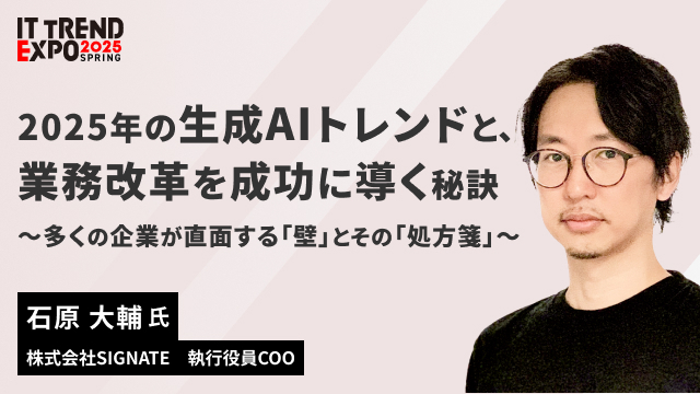 株式会社SIGNATE(本社:東京都港区、代表取締役社長:齊藤 秀、以下「SIGNATE」)は、2025年3月5日(水)~7日(金)に開催される「ITトレンドEXPO2025 Spring」にて、執行役員COO 石原大輔がスポンサー講演を行うことをお知らせいたします。