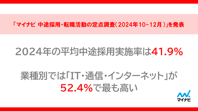 株式会社マイナビ(本社:東京都千代田区、代表取締役 社長執行役員:土屋芳明)は、全国の企業、個人を対象に実施した、「中途採用・転職活動の定点調査(2024年10月-12月)」の結果を発表しました。