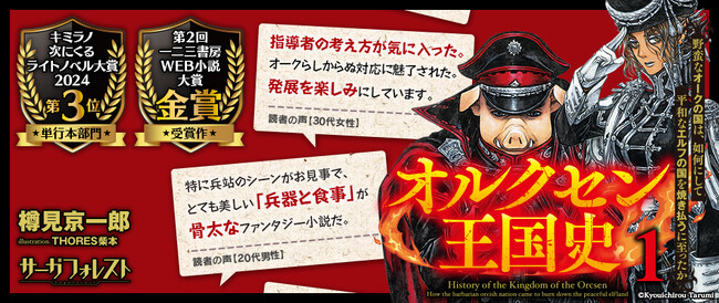 株式会社エディア(本社:東京都千代田区、代表取締役社長:賀島 義成)の子会社、株式会社一二三書房(本社:東京都千代田区、代表取締役社長:山崎 篤 以下:一二三書房)は、同社が提供するエンターテインメント小説レーベル『サーガフォレスト』にて発売中の『オルクセン王国史~野蛮なオークの国は、如何にして平和なエルフの国を焼き払うに至ったか~』が、株式会社KADOKAWAが管理、運営するwebサイト『キミラノ』にて実施された『次にくるライトノベル大賞2024』にて、「単行本部門」で3位に入賞したことをお知らせいたします。