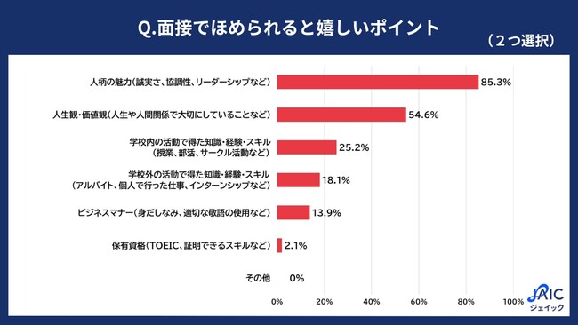 「面接でほめられると嬉しいポイントについて、当てはまるものを2つ選択してください」と質問したところ、「人柄の魅力(誠実さ、協調性、リーダーシップなど)」が85.3%、「人生観・価値観(人生や人間関係で大切にしていることなど)」が54.6%、「学校内の活動で得た知識・経験・スキル(授業、部活、サークル活動など)」が25.2%、「学校外の活動で得た知識・経験・スキル(アルバイト、個人で行った仕事、インターンシップなど)」が18.1%、「ビジネスマナー(身だしなみ、適切な敬語の使用など)」が13.9%、「保有資格(TOEIC、証明できるスキルなど)」が2.1%、「その他」が0%となりました。