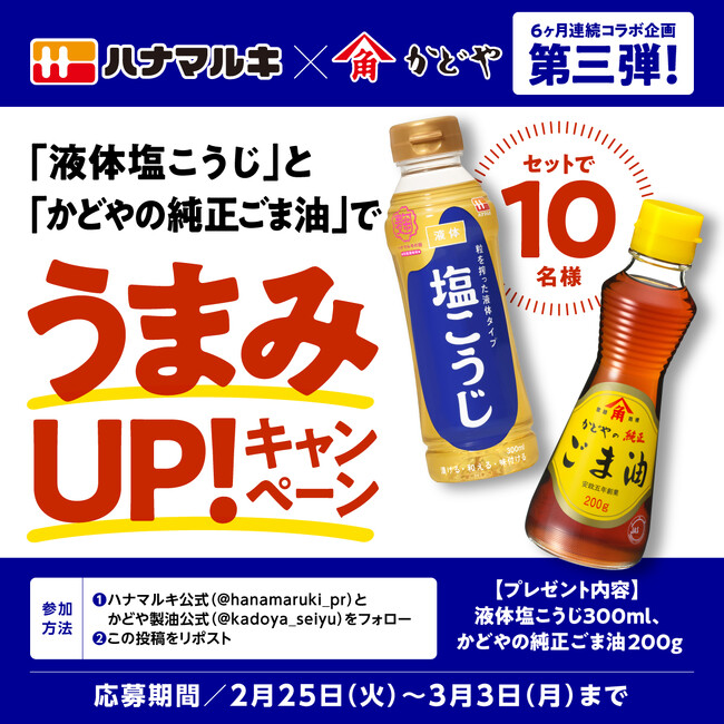 <ハナマルキ × かどや製油 コラボレーション企画>「液体塩こうじ」×「かどやの純正ごま油」2月25日(火)より、コラボレシピ公開&ハナマルキ公式X、Instagramにてプレゼントキャンペーン開始!