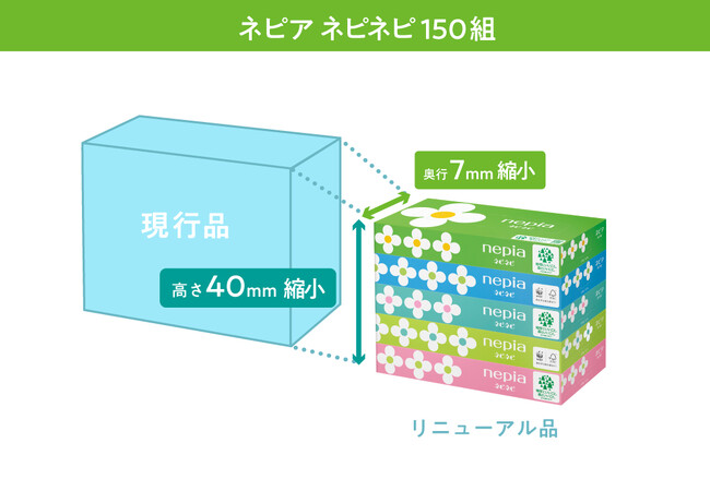 ティシュの枚数や厚みといった品質はそのまま、箱の高さと奥行きを縮小する「コンパクト化」を実施し、より持ち運びに便利で、環境負荷を低減した商品へとリニューアルします。