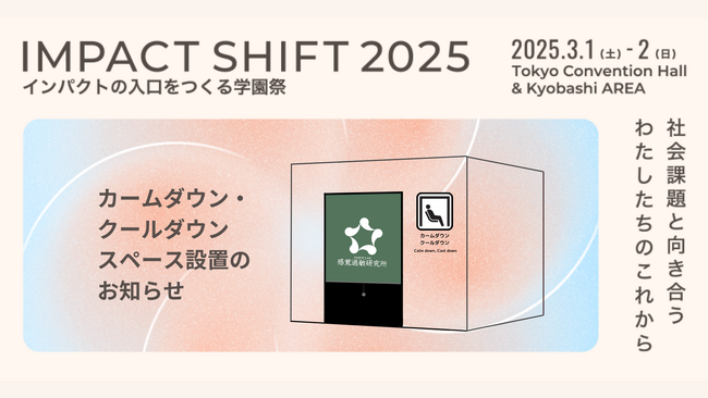 感覚過敏研究所を運営する 株式会社クリスタルロード(東京都中央区日本橋、代表取締役社長:加藤 路瑛)は、一般社団法人IMPACT SHIFT(本社:東京都日本橋、代表理事:河合 将樹)が**2025年3月1日(土)・3月2日(日)に開催する「IMPACT SHIFT 2025」**において、カームダウン・クールダウンスペースの設営に協力します。