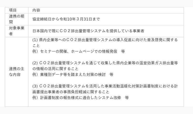 CO2排出量管理システムを提供している事業者を募集し、協定を個別に締結した上で、CO2排出量管理システムの導入促進等の取組を県と連携して実施します。