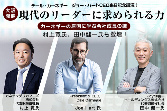 企業向けの教育研修事業と若年層向けの就職支援事業を展開する株式会社ジェイックは、DALE CARNEGIE & ASSOCIATES, INC (以下「デールカーネギー・アソシエイツ社」)、ジョー・ハートCEO来日記念講演「現代のリーダーに求められる力 カーネギーの原則に学ぶ会社成長の鍵」を、3/4(火)の東京(TKPガーデンシティPREMIUM神保町)での開催に続き、3/5(水)に大阪(TKPガーデンシティ大阪淀屋橋)での開催が決定したことをお知らせします。参加対象者は、経営者・経営幹部・人事責任者・人事担当者です。