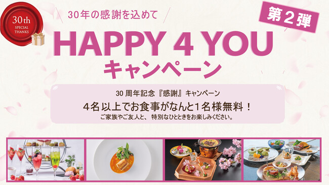 ホテルグランヴィア岡山(岡山市北区駅元町1-5、代表取締役社長:本井 誠)は、開業30周年を記念して「HAPPY 4 YOU」キャンペーン第2弾を開催いたします。本キャンペーンは、4名様で同一メニューをご利用いただくと、1名様分をホテルがプレゼント(無料)する特別な企画です。