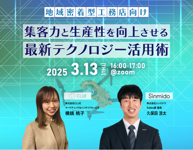 こうした背景を踏まえ、工務店様向けにドローンを販売する「株式会社CLUE」と、受注率向上を支援するツールを提供する「株式会社シンミドウ」がタッグを組み、本セミナーを開催することとなりました。 ドローンによる業務効率化と、営業支援ツールによる受注率向上の両面から、工務店様の生産性向上と売上アップをサポートします!