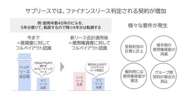 一方で、貸手側の影響は「限定的」とされ、対応を先送りする企業が多いのが現状です。しかし、会計方針の検討が進む中で「サブリース契約*1」については原資産認識が変更されることから、新規にファイナンスリース判定されるケースが多発しています。この場合、利息法に基づく計算や仕訳などの会計処理の変更が数多く発生し、予想外の影響が出ることから、貸手・サブリースの論点は「ダークホース」とも言われています。