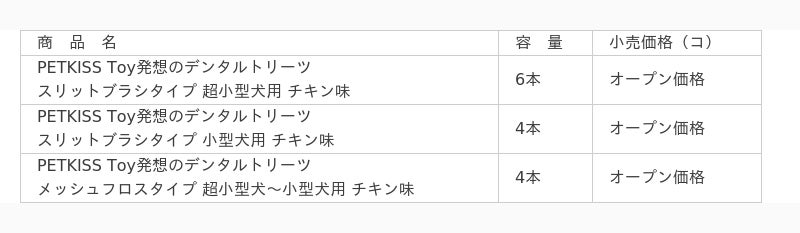 そこでこの度、美味しく噛めるおやつと噛んで楽しいおもちゃの良さを兼ね備えた“Toy発想”で、愛犬自身が遊びながら楽しく歯みがきできる『PETKISS Toy発想のデンタルトリーツ』を新発売します。
