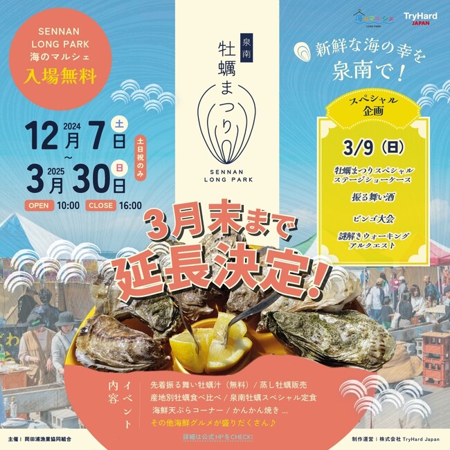 冬の味覚「牡蠣」を堪能できるイベント「泉南牡蠣まつり」を、2025年3月30日(日)まで開催期間を延長することを発表いたします。※土日祝限定