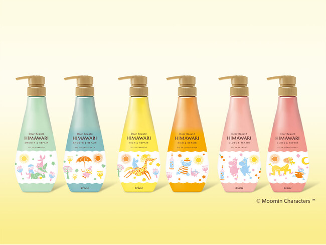 髪ゆがみの原因を髪の内部と外側からトータルケアする「ディアボーテHIMAWARI」は、ブランド共通特長成分「プレミアムヒマワリオイルEX」配合で、髪の内部にうるおいをあたえ、髪の外側のキューティクルのはがれをコートします。広がり抑制処方の「リッチ&リペア」、うるおい&ツヤUP処方の「グロス&リペア」、指通りなめらか処方の「スムース&リペア」と、髪悩みと仕上がりで選べる3ラインが「ムーミン」キャラクターで彩られ、毎日のバスルームが華やかになります。