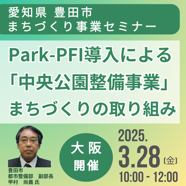 【JPIセミナー】愛知県 豊田市「Park-PFI導入による”中央公園整備事業”を始めとしたまちづくりの取り組みと今後の展開について」3月28日(金)<大阪開催>
