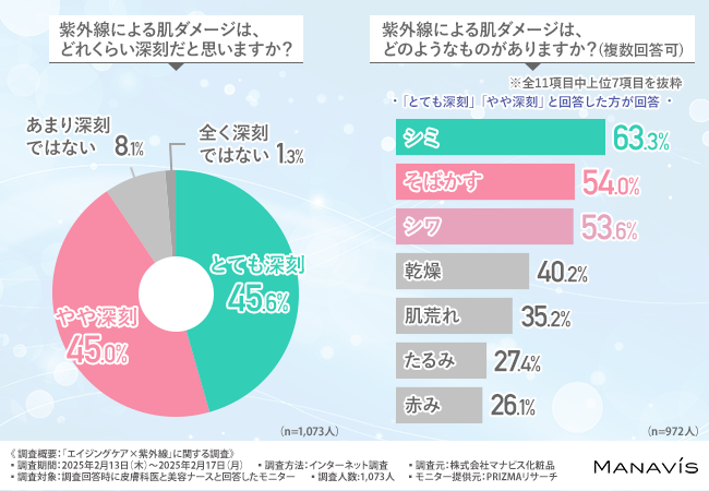 そこで今回、「マナビス エイジングケアクリーム」(https://manavis.store/products/1060)を展開する株式会社マナビス化粧品は、1.皮膚科医/2.美容ナースを対象に、「エイジングケア×紫外線」に関する調査を実施しました。