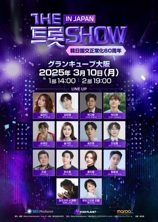 韓日国交正常化60周年を記念し、3月10日(金)に「THE トロット SHOW IN JAPAN」が大阪・グランキューブにて開催されます。(昼公演14:00~、夜公演19:00~)韓国初のトロットチャート番組「THEトロットSHOW」や、年末最大の音楽イベント「SBSトロット対戦」の制作チームが日本で初めて手がけるK-トロット公演です。