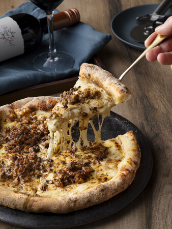 粗挽き牛のたっぷり肉汁と味わう4種類のチーズの組み合わせが相性抜群。肉汁ととろけるチーズが絡み合う、自慢のピザです!