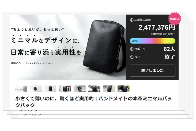 バッグ・革小物ブランド「muon」を運営する株式会社yonobi(本社:千葉県柏市、代表取締役:轟 拓哉)は、2024年10月にMakuakeにて先行販売を行い、目標達成率 990%・応援購入総額 2,477,376円を記録した「ミニマルデザインバックパック」の一般販売を、公式オンラインストアにて開始いたしました。