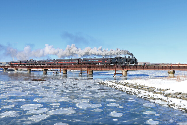 白銀の釧路湿原を、漆黒の蒸気機関車が力強く走り抜ける冬季限定の観光列車。