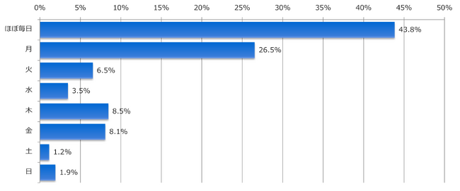 賃貸物件情報の更新頻度は「ほぼ毎日」が最多。曜日別では月曜日の更新率が26.5%と最も多い。