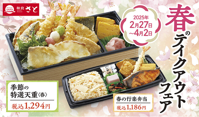 国内197店舗を展開する和食さとでは「真鯛」や「筍」、「菜の花」などの春らしい旬の食材を使ったテイクアウト商品を2月27日(木)から期間限定で販売します。”魚の王様”とも言われる「真鯛」、そしてこの季節が美味しい「菜の花」や「筍」を天ぷらにし、春らしい天重に仕上げた「季節の特選天重<春>」は税込1,294円で販売。真鯛の特徴でもある、淡泊ながら豊かな甘みをお弁当でもお楽しみいただけます。そして、「春の行楽弁当」税込1,186円は、店内でも毎年大人気の「筍ごはん」と、海老の天ぷらや焼き魚などの自慢のおかずを盛合せた行楽にもぴったりなお弁当です。「春のよくばりダブル丼」税込970円は、筍や菜の花、海老の天ぷらが入ったミニ天丼と、さとで人気の牛ステーキ丼がコンビになったよくばりセットです。寒さもだんだんと和らぎ、暖かくなるこれからの季節、いつも和食さとをご利用頂いているお客さまも、初めてのお客さまも、是非さとのテイクアウトをお楽しみください。