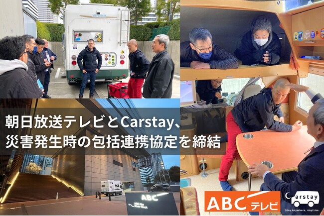 朝日放送テレビ株式会社(本社:大阪市福島区、代表取締役社長: 今村俊昭(いまむら としあき))と、キャンピングカーと車中泊スポットのシェアリング・サービス、車両製造、改装支援など国内最大級のバンライフ※のプラットフォーム事業を展開するCarstay(カーステイ)株式会社(本社:横浜市旭区、代表取締役:宮下晃樹(みやした こうき))は、大地震などの災害発生時に、朝日放送テレビの取材拠点として、Carstayが運営するキャンピングカーを貸し出す包括連携協定を締結しました。