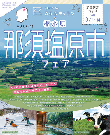 JTB グループで旅行・ライフスタイル情報を提供する株式会社JTBパブリッシング(東京都江東区、代表取締役 社長執行役員:盛崎宏行)は、直営飲食店舗「editor’s fav るるぶキッチン」(以下「るるぶキッチン」)において、2025年3月1日(土)から3月14日(金)まで、栃木県那須塩原市と連携し、『栃木県那須塩原市』特集フェアを開催します。