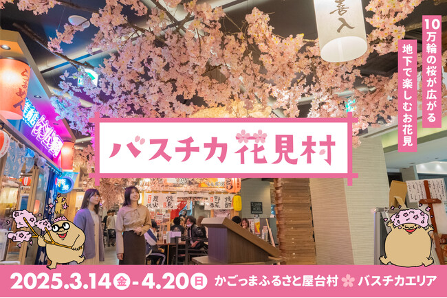 NPO法人新鹿児島グルメ都市企画(所在:鹿児島県鹿児島市、理事長:伊牟田均)が運営する「かごっまふるさと屋台村」は、「マグマやきいも電車」など数々の話題の企画を手がけるクリエイター「アフロマンス」とコラボレーションし、鹿児島中央ターミナルビル地下のバスチカエリアにて、地下で楽しめる新しいお花見をテーマにした「バスチカ花見村」を2025年3月14日(金)から4月20日(日)までの約1ヶ月間、春シーズン期間限定で開催することが決定いたしました。本イベントは昨年度も開催し、2万人以上が来村した、屋台村の新しい名物企画です。