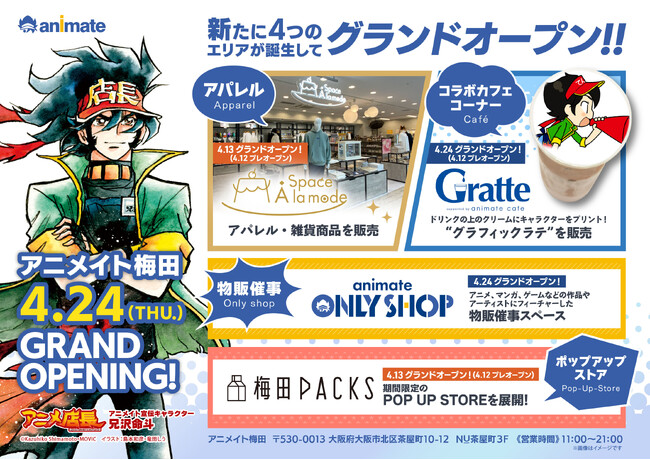 アパレル・雑貨を取りそろえる「Space A la mode」やドリンクの上のクリームにキャラクターをプリントしたグラフィックラテを楽しめる「アニメイトカフェグラッテ梅田」、物販催事スペースの「animate ONLY SHOP」やポップアップストアの「梅田PACKS」が順次オープンいたします。