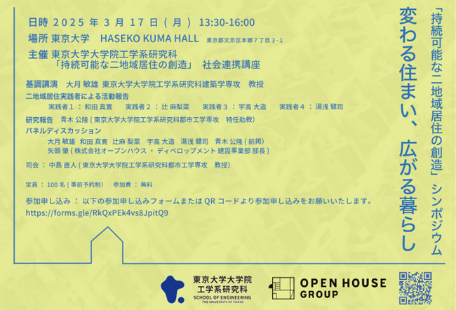 株式会社オープンハウスグループ(本社 東京都千代田区、代表取締役社長 荒井正昭、以下「当社」)と、東京大学大学院工学系研究科との「持続可能な二地域居住の創造」をテーマとする社会連携講座より、第2回公開シンポジウム「変わる住まい、広がる暮らし」が、2025年3月17日(月曜日)13時30分開始で、事前予約制にて広く一般の皆様にもご参加いただき開催されることとなりましたので、お知らせいたします。