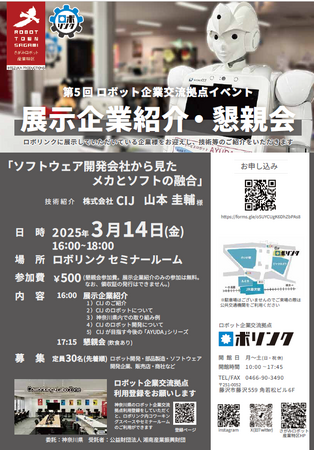 ロボット開発、部品製造、ソフトウェア開発、販売代理店、商社等、ロボット産業に携わる方やコミュニケーションロボットの導入を検討している施設・個人の方に向けた講演会(株式会社CIJによる講演)・懇親会を開催いたします。