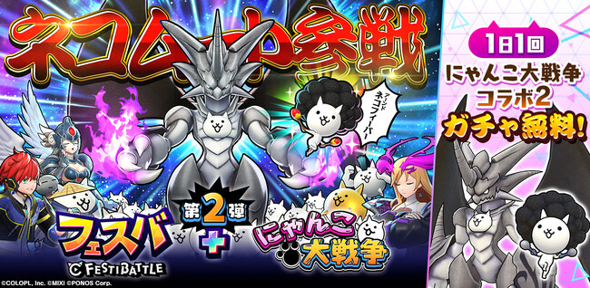 株式会社コロプラ(代表取締役社長 上席執行役員 CEO:宮本貴志、本社:東京都港区、以下「コロプラ」)は、株式会社MIXI(代表取締役社長 上級執行役員 CEO:木村弘毅、本社:東京都渋谷区、以下「MIXI」)と共に取り組んでいるスマートフォン向け新作ゲーム『フェスバ+』にて、『にゃんこ大戦争』との2回目のコラボイベントを2025年2月28日(金)より開始したことをお知らせいたします。
