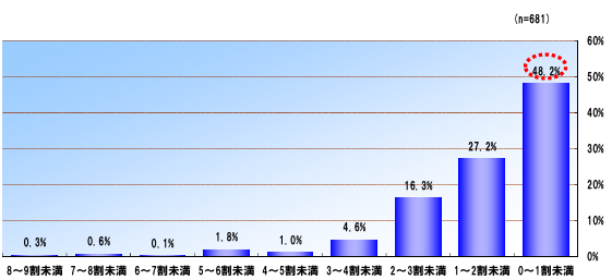 出典:三菱UFLリサーチ&コンサルティング「IoT・ビッグデータ・AI等が雇用・労働に与える影響 に関する研究会 報 告 書」より「2030年にIoTやビッグデータ、AIで担当業務が全部代替される人の割合」[https://www.mhlw.go.jp/file/04-Houdouhappyou-11602000-Shokugyouanteikyoku-Koyouseisakuka/0000166533.pdf]