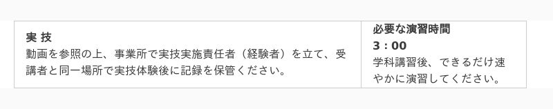 ※実技は、事業所においてリスクアセスメントツール(Excel・PowerPoint等)、道具をご準備の上、「実技実施責任者(経験者)」を立て、受講者と同一場所で対面で実施してください