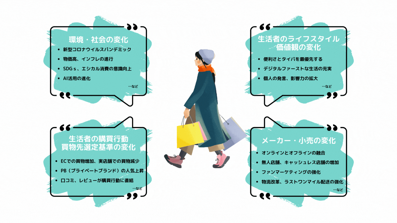 社会・環境の変化により、生活者のライフスタイルや価値観が急速に変化し、買物先を選ぶ基準もより厳しくなっています。従来、食料品や日用品の購買は「義務」として捉えられていましたが、近年は「楽しい買物」を提供する店が増え、生活者の意識も変わりつつあります。