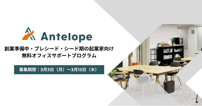 「Antelope(アンテロープ)」は、創業準備中・プレシード・シード期の起業家向け「無料オフィスサポートプログラム」です。