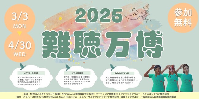 当イベントは、2022年より毎年3月3日から開催され、今年で4回目の開催となります。 前回までの主催者である、特定非営利活動法人 人工聴覚情報学会、代表理事の眞野守之さんが、「難聴や補聴に関する正しい情報を得られる場所が少ない」というご自身の経験をもとに開始されました。今回からは、特定非営利活動法人 みみトモランドが主催を継承し、引き続き「補聴」をテーマに難聴に関する多彩な情報を無料で紹介します。 インターネット上の仮想空間「メタバース」会場には、めまいや、聴覚障害者のための災害・緊急時対策などの情報も今回新たに追加され、専門医らが解説した動画も公開されています。個々人の分身となる「アバター」で他者の「アバター」と、仮想空間上でチャットなどにより情報交換ができる場となっています。