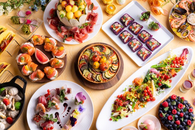 オールデイダイニング「テオリ」のビュッフェには、春色のミモザサラダやプロヴァンス風タルト、ファヒータなどカラフルなメニューが勢ぞろい。ライブキッチンではローストビーフや出来立てのパスタなどを目の前でご用意します。またレストラン「セブン・エンバーズ」では、春の地中海をイメージしたコースを提供。春野菜と楽しむ京鴨やラム、色鮮やかなオレキエッテなどが登場します。ロビーラウンジ&バー「ラティスラウンジ」では4月7日(月)からは春色を詰め込んだ「アフタヌーンティーセット“Colors”」を販売。メロンのカルパッチョをはじめマンゴーとマスカルポーネのムース、ラズベリーやチェリーを用いたケーキのほか、わさびマヨネーズの卵サンドや海苔のライスコロッケなど春の風味を感じるセイボリーも登場。