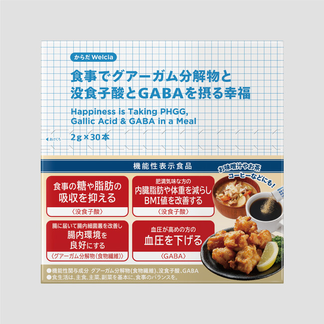 ●届出表示:本品にはグアーガム分解物(食物繊維)、没食子酸、GABAが含まれます。グアーガム分解物(食物繊維)には、腸に届いて腸内細菌叢を改善し、腸内環境を良好にする機能が報告されています。没食子酸には、食事の糖の吸収を抑え、食後の血糖値の上昇をおだやかにする機能、食事の脂肪の吸収を抑え、食後の中性脂肪の上昇をおだやかにする機能、肥満気味な方の内臓脂肪や体重を減らし、BMI値を改善する機能が報告されています。GABAには、血圧が高めの方の血圧を下げる機能が報告されています。
