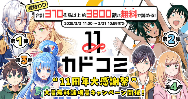 祝11周年! 人気マンガ合計370作品以上・約3800話が週替わり無料! 「カドコミ11周年 大感謝祭」本日2025年3月3日(月)より開催