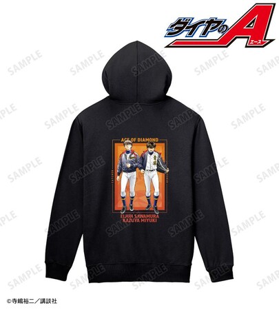 寺嶋裕二先生描き下ろしイラストの沢村栄純、御幸一也、作品名、キャラクターの名前、背番号をジップパーカーに仕上げました。