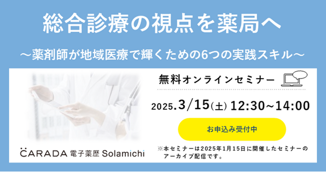 株式会社ソラミチシステム(東京都新宿区、代表取締役:田浦 貴大)は、本年1月に開催した、無料オンラインセミナー「総合診療の視点を薬局へ ~薬剤師が地域医療で輝くための6つの実践スキル~」を、ご好評につき、3月15日(土)12:30より無料で視聴可能なアーカイブ動画で公開します。