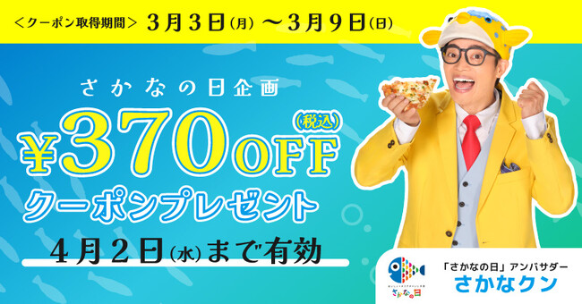 ピザーラでは、3月の「さかなの日」にちなんだ特別企画「370円OFFクーポンプレゼント」をピザーラ公式サイトで実施いたします!お得なクーポンは3月3日~9日の期間、ピザーラ公式サイト会員ならどなたでも特設ページより取得できます。