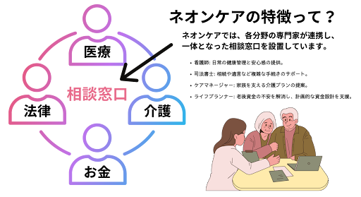 ネオンケアは高齢者の不安や悩みに寄り添い、これまで点在していた窓口を、医療・法律・介護・お金それぞれの分野のプロがワンチームで包括的に支援することで生活の質を高めることが可能になります。